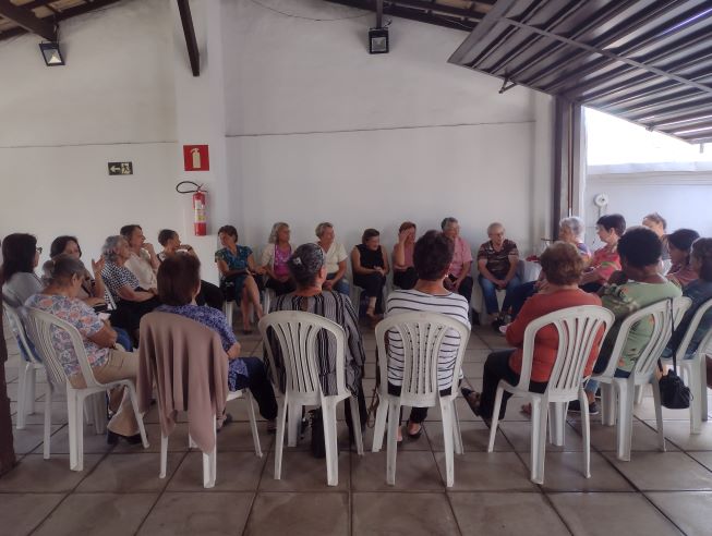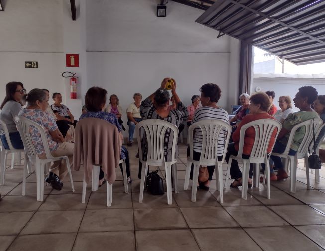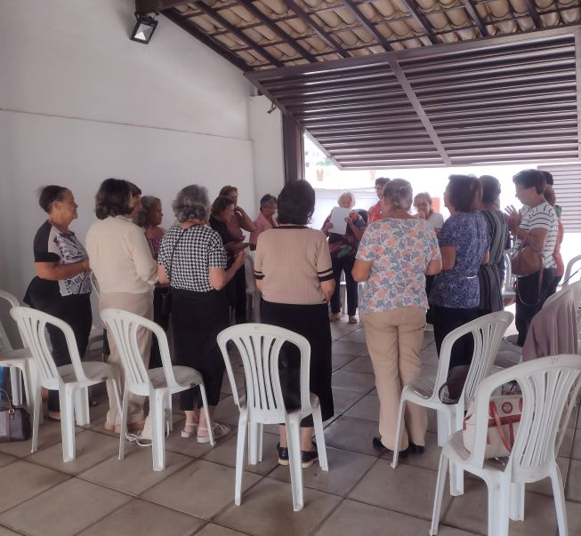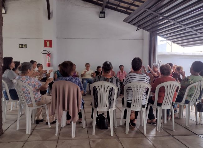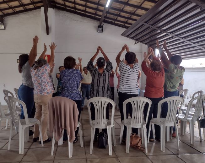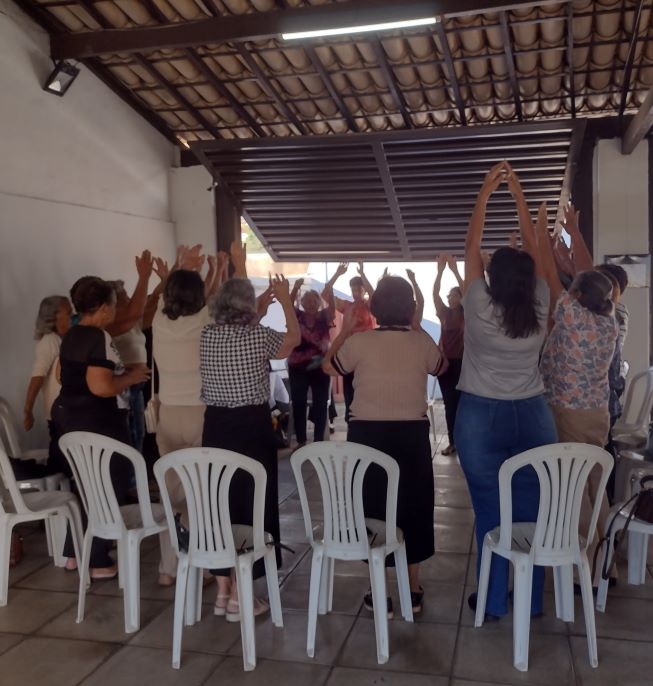 Projeto Vivendo a Maturidade. Tivemos a abertura com orações e recados. Fizeram exercícios com os dedos e com as mãos, e em seguida a dinâmica da bola, foi bem divertido. D. Marta ensinou nova música e dança. Comentaram sobre a festa junina que será realizada no último encontro de junho. Foi servido um delicioso café patrocinado pela Prefeitura de Pará de Minas, 09.06.2025.