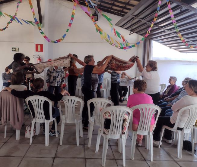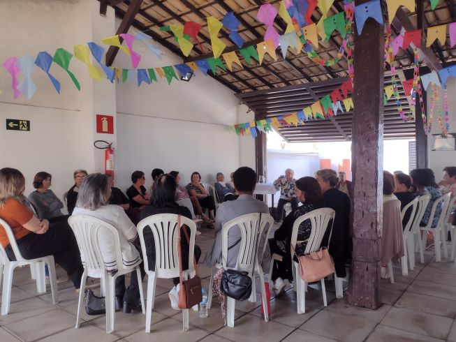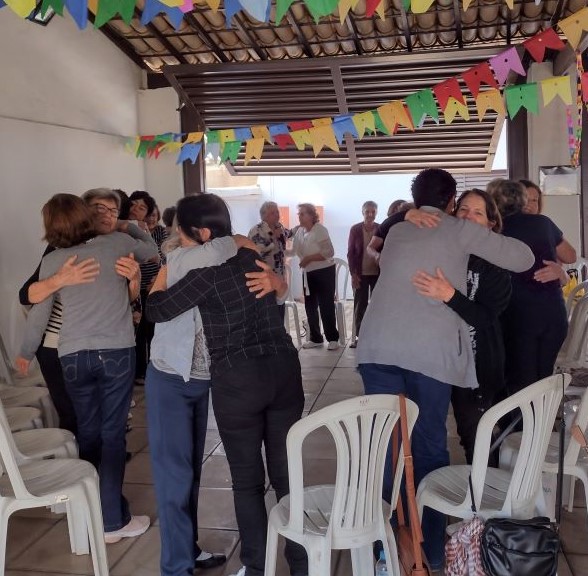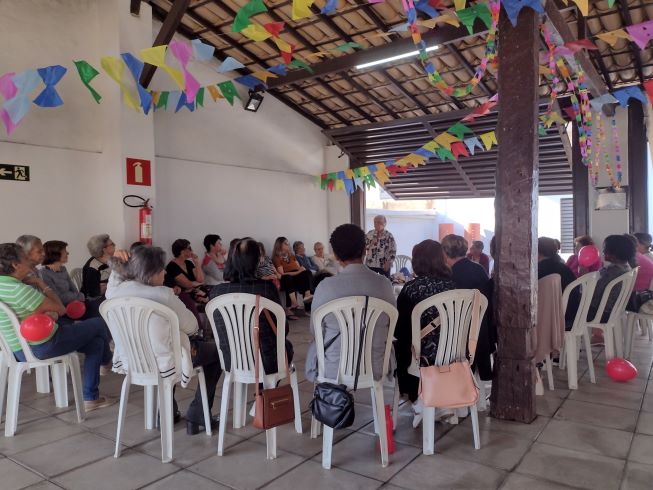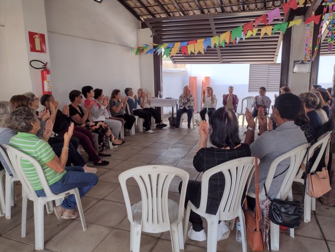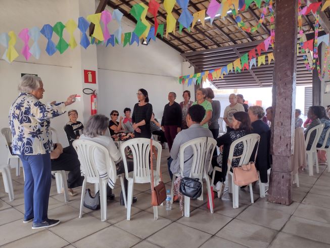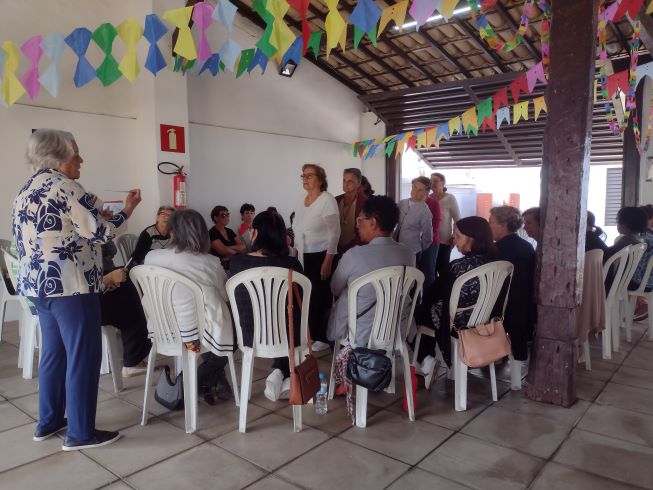 Projeto Vivendo a Maturidade. Tivemos a abertura com boas vindas e orações. Exercício com os dedos das mãos para melhorar a flexibilidade, e a memória. Dinâmica sobre “Escolha”, as participantes ficavam em fila, e D. Marta, de frente mostrando as placas: Abacate/Abacaxi – Praia/Montanha – Avião/Carro – Verde/vermelho – Frio/Quente - Abraço/Beijo, elas tinham que escolher. D. Marta contou uma história de Luís Fernando Veríssimo na Terapia, no final todas riram bastante. Dança de relaxamento com a música “CRY TO ME” (Chore por mim), de Salomon Burke. Brincadeira do balão, todas enchem o balão, e de dupla balançavam o balão num lenço sem deixar cair. Foram dados os visos pra próxima reunião. Foi servido um delicioso café patrocinado pela Prefeitura de Pará de Minas, 07.07.2025.
