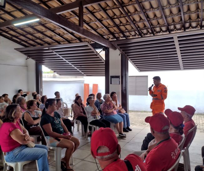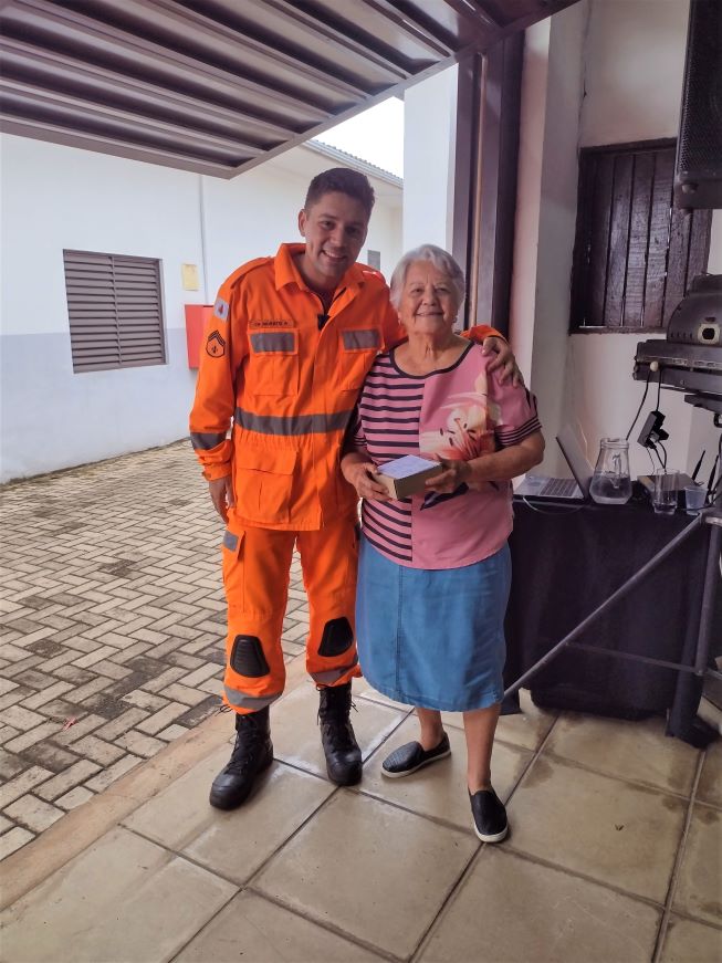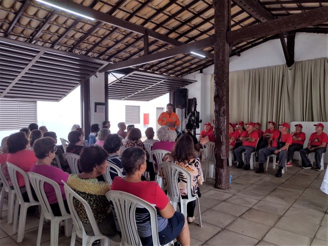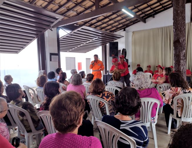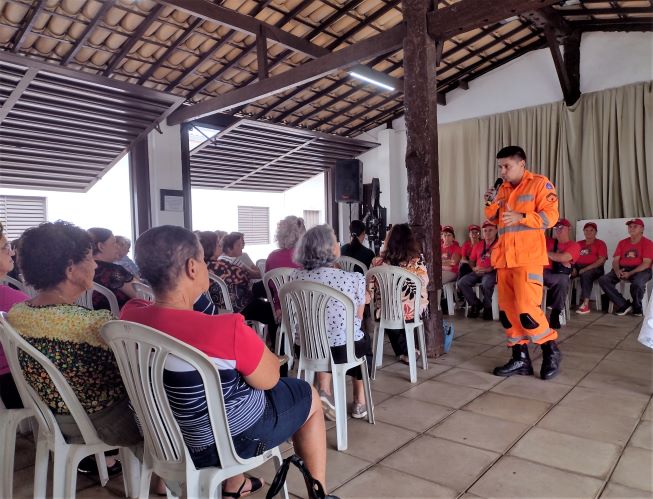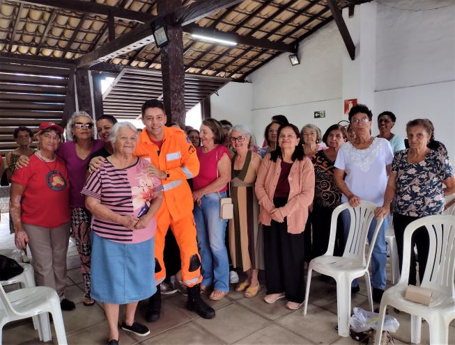 Projeto Vivendo a Maturidade. Palestra do Corpo de Bombeiros sobre Primeiros Socorros. A palestra foi ministrada pelo Cabo do Corpo de Bombeiros Leandro Santos Morato. Contamos com a participação da turma de Bombeiros Sênior. A palestra abordou assuntos de primeiros socorros, como proceder em situações de queda, engasgo, etc. A quem recorrer como Bombeiros, Samu. Houve também simulação de como socorrer uma pessoa em situação de engasgo completo. Duas pessoas do Bombeiro Sênior fizeram a simulação. Além de explanar sobre diversas situações de perigo, o palestrante sanou todas as dúvidas das participantes do projeto. No final foi servido um delicioso café fornecido pela Prefeitura.